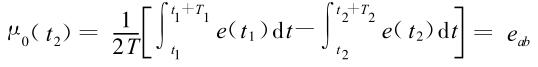 ②正負(fù)勵(lì)磁下的同相位采樣。圖1 是對(duì)應(yīng)低頻矩形波勵(lì)磁形式下的典型電勢(shì)信號(hào)形式,按上述關(guān)系在一個(gè)勵(lì)磁周期下 ,若假設(shè) t 1 和 t 2 點(diǎn)為工頻干擾的等效干擾點(diǎn) , 且采樣寬度 T =T 1 =T 2 ,則 e ab 的基本算式為