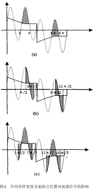 圖4(a)~ (c)直觀地描述了不同采樣寬度及采樣起始點(diǎn)位置對(duì)流量信號(hào)的影響 。設(shè)為信號(hào)采樣起始相位角,令為相位差 ;為采樣寬度誤差 都很小 ,可視為無(wú)窮小 。圖4(a)的采樣寬度為誤差為