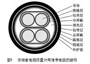 在石油化工、冶金、食品飲料、制藥、造紙、染料等眾多領(lǐng)域,通常采用污水處理流量計(jì)對(duì)流動(dòng)的各種混濁、懸浮液體介質(zhì)(水煤漿、泥漿污水、水泥混凝土漿、紙漿、金屬流體等)的流量進(jìn)行測(cè)量。污水處理流量計(jì)用信號(hào)電纜主要用于將污水處理流量計(jì)的實(shí)際測(cè)量結(jié)果信號(hào)傳輸至顯示系統(tǒng)。隨著污水處理流量計(jì)測(cè)量系統(tǒng)中電路的日趨復(fù)雜和對(duì)信號(hào)傳輸要求的逐步提高,傳統(tǒng)污水處理流量計(jì)用信號(hào)電纜的性能已無法滿足使用要求,因此本公司開展了一種新型低噪音污水處理流量計(jì)用信號(hào)電纜的研制。