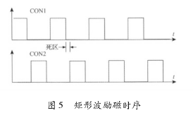 該電路主要由勵(lì)磁時(shí)序發(fā)生單元、三態(tài)緩沖器及隔離光耦組成。勵(lì)磁時(shí)序由印染污水流量計(jì)系統(tǒng)的控制核心產(chǎn)生。采用DSP的EPWM外設(shè)模塊,通過(guò)設(shè)定其內(nèi)部定時(shí)器的工作模式發(fā)出所要求的勵(lì)磁頻率的勵(lì)磁時(shí)序PWM信號(hào)CT_1和CT_2。由于勵(lì)磁控制系統(tǒng)中的勵(lì)磁工作電源的電壓要比DSP的工作電源電壓高得多,為防止勵(lì)磁電路故障對(duì)系統(tǒng)控制核心產(chǎn)生致命影響,采用光耦將控制部分與勵(lì)磁部分進(jìn)行隔離。另外,由于DSP引腳的驅(qū)動(dòng)能力有限,所以在DSP與隔離光耦之間加入三態(tài)緩沖器以驅(qū)動(dòng)隔離光耦的輸入級(jí)。并且,DSP能夠通過(guò)GPIO口控制三態(tài)緩沖器上的使能引腳來(lái)使能和禁止勵(lì)磁,以在檢測(cè)到電路故障時(shí)迅速關(guān)斷H橋所有橋臂。該勵(lì)磁時(shí)序產(chǎn)生電路通過(guò)軟件編程可產(chǎn)生如圖5所示的單頻矩形波。在實(shí)際應(yīng)用中,由于組成H橋的達(dá)林頓三極管與MOS管導(dǎo)通與關(guān)斷的時(shí)間不一致,易在勵(lì)磁方向切換瞬間,產(chǎn)生上下橋臂同時(shí)導(dǎo)通的現(xiàn)象,反映在勵(lì)磁電流波形上為一幅值很高的窄脈沖。該脈沖電流不僅容易引起遲滯比較電路的誤輸出,從而導(dǎo)致高低壓切換電路與電流旁路電路的誤動(dòng)作,而且對(duì)恒流控制電路產(chǎn)生沖擊,減小三端穩(wěn)壓芯片的使用壽命,同時(shí)還會(huì)產(chǎn)生EMC電磁干擾,給測(cè)量精度帶來(lái)影響。所以實(shí)際應(yīng)用時(shí),如圖5所示對(duì)方波勵(lì)磁時(shí)序添加死區(qū),可以明顯減小上述現(xiàn)象。
