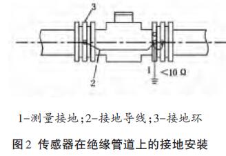 傳感器安裝在塑料管道或內壁有絕緣涂層、襯里的管道上,兩端應安裝接地環(huán)(或帶有接地電極的金屬短管),然后用導線連接,使管內流動的介質與大地短路,具有零電位(見圖2)。
