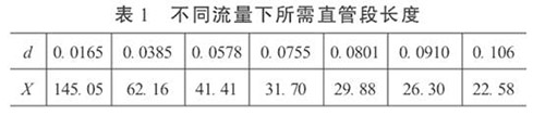 3.直管段長度和生物柴油流量計(jì)精度的初步預(yù)測在工程設(shè)計(jì)中,根據(jù)流體性質(zhì)、流量和雷諾數(shù)確定α和d值。這樣,按照式(5)就可以依不同的流量計(jì)精度要求,對直管段長度進(jìn)行初步預(yù)測,或確定直管段長度后,對流量計(jì)的精度做初步預(yù)測。當(dāng)δ= 0.2%時(shí),不同流量下所需直管段長度見表1。
