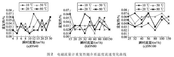 將實(shí)驗測得的環(huán)保污水專用流量計在不同溫度及流速下的重復(fù)性數(shù)據(jù)整理,特性曲線如圖2所示,3組曲線分別對應(yīng)DN40、DN80、DN100的3塊環(huán)保污水專用流量計的重復(fù)性曲線。