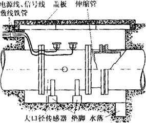 由于大口徑管道在多數(shù)場合下是埋在地下的,因此大口徑傳感器在安裝前應做好水泥地坑。圖6-19所示是在給排水系統(tǒng)中常見的安裝形式。水泥地坑應有足夠的活動空間,側(cè)壁埋有敷設電纜的鋼管,上有蓋板防止雨淋,下有泄水管以免坑內(nèi)積水而使傳感器侵水。為了拆裝方便,傳感器應放在墊腳上,且在下游側(cè)裝有活絡的伸縮管。圖6-20是熱水流量計在地下水泥管污水排放系統(tǒng)中的安裝實例。
