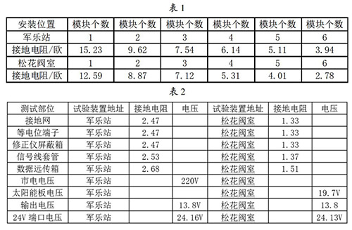 接地網(wǎng)的安裝與連接:接地網(wǎng)是整個乙二醇流量計防雷試驗比較關(guān)鍵的一個內(nèi)容,能不能準(zhǔn)確的論證試驗的有效性,必須保證接地網(wǎng)達(dá)到標(biāo)準(zhǔn)的接地電阻,通過對實地地電阻率的測試,初步選擇6個接地模塊埋設(shè)并配用降阻劑使用,邊安裝邊測試直到達(dá)到標(biāo)準(zhǔn)值后才引入等電位箱。在軍樂站和松花閥室安裝模塊并測試數(shù)據(jù)見表1。