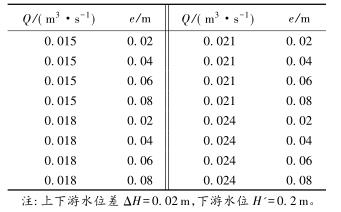 有限水域的浮體結構在不同來流動水中運行時,浮體結構位置的改變會對流場產生影響,從而影響浮體結構的泄流能力以及穩(wěn)定性。試驗過程中固定浮體結構的體型不變(長L=0.20m,寬B=0.30m,高a=0.10m),分別選取4種不同來流流量Q及浮體結構位置e,控制浮體結構在上、下游水位不變的條件下進行試驗,具體試驗參數(shù)設計及說明見表1以及圖2。