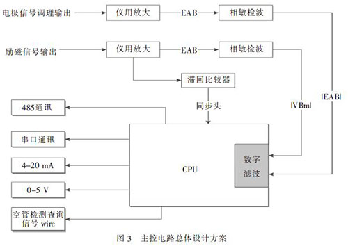 電極檢測出的微弱感應電動勢E, 先經(jīng)前置放大器的放大和噪聲抑制而成為大幅度低阻抗的電壓信號。此信號經(jīng)相敏檢波后,給CPU 進行數(shù)字濾波、處理和控制,通過利用雙線性變換法將模擬的二階巴特沃斯低通濾波器轉換為數(shù)字式濾波器,既簡化電路設計,且可靠性高、穩(wěn)定性好。通過編寫軟件CPU 能對放大器的溫度漂移及零點漂移給予補償, 并在測量的全量程范圍內分10 段對信號進行非線性修正,使得測量值更好地擬合真實數(shù)據(jù)??展軝z測電路上,CPU 作為從控制器。當主控制電路上發(fā)出空管檢測查詢信號wire, 從控制器進行識別后接收并判斷出查詢什么信號,然后產(chǎn)生應答信號上傳至主控芯片輸出顯示;當檢測為空管信號時, 從CPU 發(fā)出的zero 信號通過控制MOS 管開關來關斷流速輸出。在應用中,對于微弱信號的放大及提取還需注意PCB 板設計時EMI 電磁屏蔽考慮,屏蔽來自空間磁場的干擾、周邊設備的輻射造成的干擾和板內之間的干擾,如數(shù)模分離、強弱電分離等等。