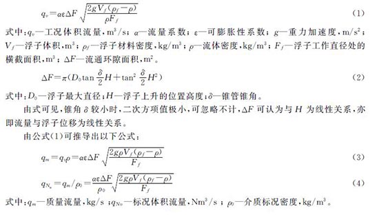 流量計(jì)垂直安裝在管道上,流體自下向上流經(jīng)錐管,浮子在P1、P2差壓作用下產(chǎn)生上升或下移,當(dāng)浮子此差壓(P2-P1)與浮子重力G、浮力F、粘滯力合力平衡時(shí),處于平衡狀態(tài)。建立方程并推導(dǎo)(可參考相關(guān)專(zhuān)業(yè)資料,此處省略),忽略粘滯力影響,假設(shè)流量系數(shù)為常數(shù),可得出浮子位移與流量成線性對(duì)應(yīng)關(guān)系。浮子流量計(jì)的流量方程為: