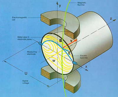 電磁流量計的工作原理是基于法拉*電磁感應(yīng)定律。在測量管內(nèi)的導(dǎo)電介質(zhì)相當(dāng)于法拉*試驗中的導(dǎo)電金屬桿,上下兩端的兩個電磁線圈產(chǎn)生恒定磁場。當(dāng)有導(dǎo)電介質(zhì)流過時,則會產(chǎn)生感應(yīng)電壓。管道內(nèi)部的兩個電極測量產(chǎn)生的感應(yīng)電壓。