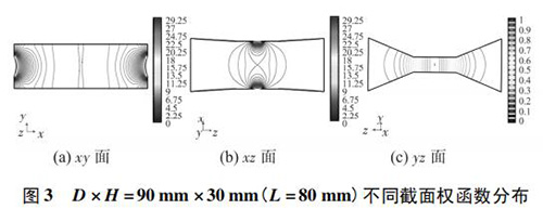 4) 圖 3( c) 、圖 4( c) 的 yz 面權(quán)函數(shù)分布表明,D = 90 mm時(shí)的權(quán)函數(shù)等勢線間距略大于 D = 60 mm 時(shí)的權(quán)函數(shù)等勢線間距,權(quán)函數(shù)變化梯度較小,且中心區(qū)域的權(quán)函數(shù)等勢線逐漸變?yōu)橹本€,因此 D = 90 mm 的權(quán)函數(shù)分布更均勻一些,但是兩者區(qū)別很小,即寬度改變對 yz 面權(quán)函數(shù)分布影響很小。圖 4( c) 、圖 5( c) 的 yz 面權(quán)函數(shù)分布表明,H = 30 mm時(shí)的權(quán)函數(shù)等勢線間距較大,且中心區(qū)域的權(quán)函數(shù)等勢線逐漸變?yōu)橹本€,因此 H = 30 mm 的權(quán)函數(shù)分布更加均勻;