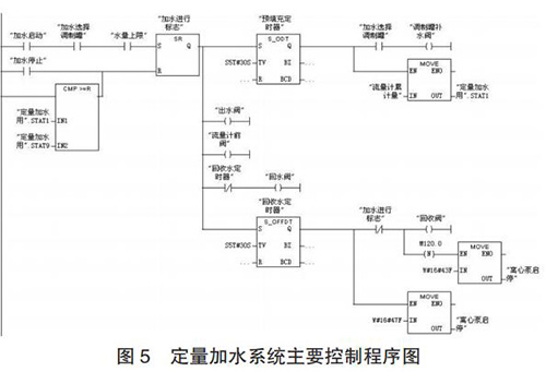定量加水系統(tǒng)的工作過程為:當(dāng)設(shè)定好加水量后,啟動系統(tǒng),多級離心泵 10、回流閥 4、出水閥 9 和流量計(jì)前閥 12開啟對管路進(jìn)行預(yù)填充;延時 30s 預(yù)填充完成后,回流閥 4關(guān)閉,調(diào)制罐補(bǔ)水閥 14 開啟,同時質(zhì)量流量計(jì) 13 開始計(jì)量;當(dāng)質(zhì)量流量計(jì)的累積量與設(shè)定加水量一致時,出水閥 9 和調(diào)制罐補(bǔ)水閥 14 關(guān)閉;調(diào)制罐定量加水完成后,開啟回收閥17 和回流閥 4 以及同未關(guān)閉流量計(jì)前閥 12 一起,利用壓縮空氣對管道中水實(shí)現(xiàn)回收;延時 30s 水回收完成后,關(guān)閉多級離心泵、球閥 4、12 和 17,定量加水過程完成。定量加水系統(tǒng)主要控制程序如圖 5 所示。