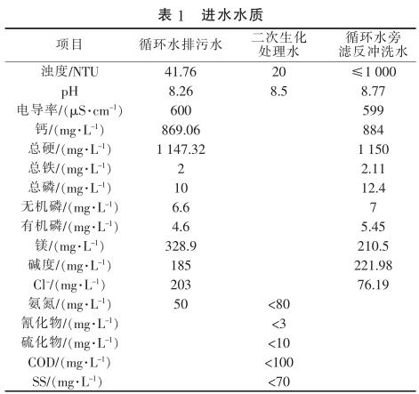由表1可知,循環(huán)水排污水濁度較高,硬度大,主要是鈣鹽、鎂鹽含量較高;二次生化處理水是經(jīng)現(xiàn)有的生化處理系統(tǒng)處理后的氣化灰水、沖渣水等廢水,其氨氮、COD需進(jìn)一步去除,以利于后續(xù)脫鹽處理系統(tǒng)的運行。