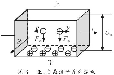 反之,如圖2所示,若載流子帶負(fù)電荷,則載流子在洛倫茲力作用下會向下偏轉(zhuǎn),導(dǎo)體下表面積累負(fù)電荷。同時,上表面失去負(fù)電荷而帶上正電,從而使上表面電勢高于下表面。