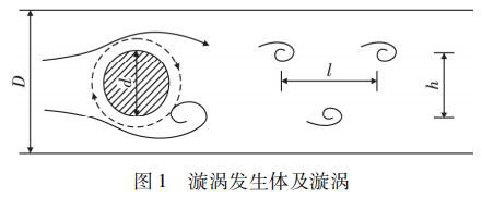 氫氣流量計(jì)是由漩渦發(fā)生體、頻率檢測器和信號轉(zhuǎn)換器等環(huán)節(jié)組成,輸出 4 ~ 20 mADC 信號或脈沖電壓信號。其測量原理是在流動(dòng)的流體中的垂直流動(dòng)方向安放 1 根或多根非流體型阻流體,在一定的流量范圍內(nèi),流體在阻流體兩側(cè)交替地分離、釋放出 2 串頻率正比于管道內(nèi)的平均流速、規(guī)則的、不對稱有規(guī)律的交替漩渦列,如圖 1 所示,且兩側(cè)漩渦旋轉(zhuǎn)方向相反。采用檢測元件測出漩渦頻率就可以推算出流體的流量。