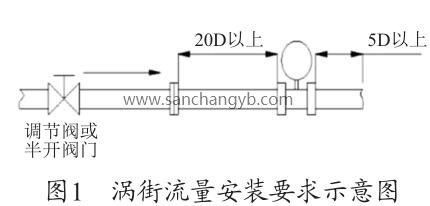 根據(jù)圖1渦街流量安裝要求示意圖及廠家的設(shè)備說(shuō)明書(shū)要求,流量計(jì)上游的直管段長(zhǎng)度至少為20D≈1 600mm,下游的直管段至少在5D≈400mm,D=80mm 為管道直徑。圖2為現(xiàn)場(chǎng)安裝圖,流量計(jì)上游僅為600mm <1 600mm,此流量計(jì)安裝位置有誤,對(duì)測(cè)量值有一定的影響,造成測(cè)量偏差,需調(diào)整流量計(jì)的安裝位置。