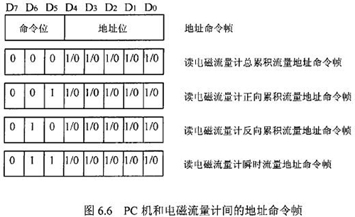 由于RS一485電氣標準規(guī)定每段只能聯結犯個節(jié)點設備,因此可用地址幀中五個二進制位表示這32個地址,其余3位用來表示命令,從而構成地址命令幀。對于控制命令需求不超過八個的通信系統,采用地址命令幀可壓縮報文長度提高通信效率。在污水網絡監(jiān)控系統中,測水流量計和PC機通信的主要目的是將流量計中的有用數據讀到PC機中。這些數據包括:總累積流量、正向累積流量、反向累積流量、瞬時流量。通信時,PC機只需向測水流量計發(fā)送讀總累積流量、讀正向累積流量、讀反向累積流量、讀瞬時流量命令即可,因此二者間通信所用的地址幀和命令幀可合二為一,用一個地址命令幀代替。PC機和測水流量計間的地址命令幀定義如圖.66所示。根據污水網絡監(jiān)控系統中PC機與測水流量計間通信的特殊性,二者通信所使用的報文可簡化為圖.67的格式。