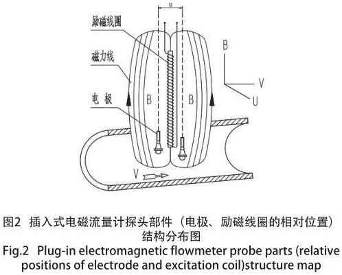 煤層注水流量計(jì)的測(cè)量探頭測(cè)得管道內(nèi)部特定位置(管道內(nèi)徑的 1/8 處)的局部流速,以確定管道流速,煤層注水流量計(jì)的傳感器是在測(cè)量探頭外側(cè)形成外發(fā)射磁場(chǎng),測(cè)量電極在傳感器的端部。
