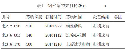 表1為一體式渦街流量計打撈統(tǒng)計表,可以看出自2016年9月開始即在現(xiàn)場進行了應用。為了展示試驗成果的普遍性,分別從不同注入方式、不同落物深度、不同落物原因的角度,共應用3口鋼絲落物井,打撈成功為100%。