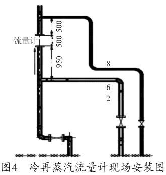 根據(jù)圖1渦街流量安裝要求示意圖及廠家的設(shè)備說明書要求,流量計(jì)上游的直管段長度至少為20D≈1 300mm,下游的直管段至少在5D≈325mm,D=65mm 為管道直徑。圖4為冷再蒸汽流量計(jì)現(xiàn)場安裝圖,流量計(jì)上游僅為950mm<1600mm,此流量計(jì)安裝位置有誤,對(duì)測量值有一定的影響,造成測量偏差,需調(diào)整流量計(jì)的安裝位置。