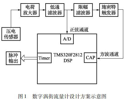 本文設(shè)計的基于 TMS320F2812 DSP 的數(shù)字鍋爐煙氣流量計的信號處理系統(tǒng)由前置放大電路和數(shù)字信號處理電路兩部分組成。本文選用的前置放大電路即為目前被廣泛應(yīng)用的普通流量計的前置放大電路,主要由電荷放大電路、低通濾波電路、限幅濾波電路和施密特觸發(fā)電路組成; 對于經(jīng)壓電傳感器測得的渦街信號采用了頻域分析和時域分析相結(jié)合的方式,即由前置放大電路和數(shù)字信號處理電路相配合。時域分析通道利用 DSP 事件管理器的捕獲模塊,對前置放大電路輸出的方波進(jìn)行頻率計算,然后再由 DSP 事件管理器通用定時器的比較輸出模塊進(jìn)行脈沖輸出。頻域分析通道即 DSP對低通濾波電路輸出的疊加了許多噪聲的正弦信號進(jìn)行 A/D 采樣,再利用 DSP 對 A/D 采樣的結(jié)果進(jìn)行頻譜分析,從而得出此時渦街信號的頻率,*后由 DSP 通用定時器的比較輸出模塊進(jìn)行脈沖輸出。系統(tǒng)設(shè)計方案示意圖如圖 1 所示。