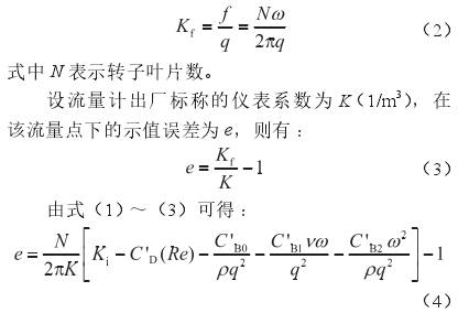 式中q表示體積流量,m3/s;ν表示介質(zhì)的運動黏度,m2/s;雷諾數(shù)Re=4q/(πdν);d表示流量計口徑,m;ρ表示介質(zhì)的密度,kg/m3;C'D、C'B0、C'B1和C'B2分別表示4個待定系數(shù),在某個流量點下標(biāo)定出的儀表系數(shù)(Kf,表示單位體積流體通過流量計時,流量計輸出的脈沖數(shù),1/m3)和轉(zhuǎn)子葉片頻率(f,s-1)的關(guān)系為: