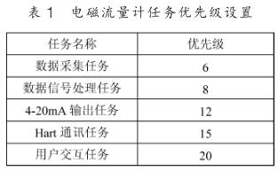 下面以電磁流量計(jì)為例說(shuō)明基于 μC/OS-III 的人機(jī)界面設(shè)計(jì)。 先將 μC/OS-III 移植到 Cortex-M3 處理器上,這里選用的是 STM32F103VET6 。電磁流量計(jì)的應(yīng)用程序若按照上節(jié)的任務(wù)種類(lèi)劃分有: 數(shù)據(jù)采集任務(wù)、數(shù)據(jù)處理任務(wù), 4~20mA輸出任務(wù), Hart 通訊任務(wù)以及用戶交互任務(wù)。 先對(duì)不同的任務(wù)進(jìn)行優(yōu)先級(jí)的劃分,如表 1 所示。