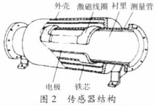 電磁流量計(jì)由流量傳感器和轉(zhuǎn)換器兩部分組成。傳感器典型結(jié)構(gòu)示意如圖2,測(cè)量管上下裝有激磁線(xiàn)圈,通激磁電流后產(chǎn)生磁場(chǎng)穿過(guò)測(cè)量管,一對(duì)電極裝在測(cè)量管內(nèi)壁與液體相接觸,引出感應(yīng)電勢(shì),送到轉(zhuǎn)換器。激磁電流則由轉(zhuǎn)換器提供。