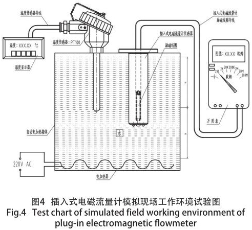 其原因是:勵磁線圈的阻值及匝數(shù)是按照常溫狀態(tài)下進行設計的,而含有勵磁線圈的測水流量計經(jīng)常是高于常溫狀態(tài)下進行安裝、使用(如:高爐回水、供熱管道等),勵磁線圈的阻值隨使用環(huán)境溫度的變化而變化,致使測水流量計測量時的準確度大為降低,性能的不確定性大為增加,為了保證儀表的高準確度和穩(wěn)定性,在不同的季節(jié)(主要是環(huán)境溫度和介質(zhì)溫度),經(jīng)過大量模擬現(xiàn)場實際情況的試驗,并結合轉(zhuǎn)換器的技術參數(shù)要求,得出一個完善的勵磁線圈各種技術參數(shù)。模擬現(xiàn)場試驗裝置如圖 4 所示。