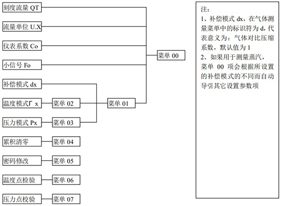 3.1、本儀表表頭采用自導(dǎo)引式和菜單式相結(jié)合的參數(shù)設(shè)置方式,所謂自導(dǎo)引式參數(shù)設(shè)置方式就是用戶在進(jìn)入菜單 00 項(xiàng)后,表頭中的微電腦會(huì)自動(dòng)導(dǎo)引用戶去設(shè)置需要設(shè)置的參數(shù)。另外,用戶也可以通過(guò)菜單模式分別對(duì)各組參數(shù)進(jìn)行設(shè)置。蒸汽測(cè)量菜單框圖如下: