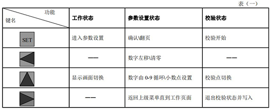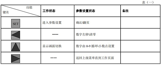 (3)標(biāo)況流量計(jì)算公式(若補(bǔ)償后單位為 U.0):(4)標(biāo)況流量計(jì)算公式(若補(bǔ)償后單位為 U.1):注:標(biāo)況指 20℃,1 標(biāo)準(zhǔn)大氣壓三、一體化液晶顯示表頭參數(shù)設(shè)置操作說明(V03Z)1、鍵盤按鍵說明2、 顯示窗字符說明注:表中 x 代表“0”或“1”;Zn:標(biāo)準(zhǔn)狀態(tài)下(20℃,1 標(biāo)準(zhǔn)大氣壓),被測氣體的壓縮系數(shù),Z:工作狀態(tài)下被測氣體的壓縮系數(shù)3、 操作說明3.1、本儀表表頭采用自導(dǎo)引式和菜單式相結(jié)合的參數(shù)設(shè)置方式,所謂自導(dǎo)引式參數(shù)設(shè)置方式就是用戶在進(jìn)入菜單 00 項(xiàng)后,表頭中的微電腦會自動導(dǎo)引用戶去設(shè)置需要設(shè)置的參數(shù)。另外,用戶也可以通過菜單模式分別對各組參數(shù)進(jìn)行設(shè)置。蒸汽測量菜單框圖如下:3.2、參數(shù)設(shè)置約定:在設(shè)置各項(xiàng)參數(shù)時(shí),提示符閃動代表該項(xiàng)參數(shù)沒有設(shè)置完或者尚未確認(rèn),可以通過按SET 鍵來確認(rèn)或者按→鍵退出;提示符不閃動代表該項(xiàng)參數(shù)已設(shè)置完并確認(rèn),此時(shí)可以通過按 SET 鍵翻頁或者按→鍵退出。進(jìn)入?yún)?shù)設(shè)置時(shí),需要輸入密碼(6 位)并確認(rèn)進(jìn)入,為了防止誤進(jìn)入?yún)?shù)設(shè)置菜單,保證儀表正常工作,在設(shè)置密碼時(shí),使用↑鍵調(diào)數(shù)時(shí)不能循環(huán)調(diào)數(shù),只能單次調(diào)數(shù),只有密碼輸入正確進(jìn)入各項(xiàng)參數(shù)設(shè)置菜單后才可以對各位循環(huán)連續(xù)調(diào)整數(shù)據(jù)。3.3、儀表參數(shù)設(shè)置舉例:儀表出廠前各項(xiàng)參數(shù)已設(shè)置好,用戶無需設(shè)置。如果用戶需要設(shè)置某項(xiàng)參數(shù),請參照以下步驟,例如修改刻度流量值 QT:在工作狀態(tài)下,按 SET 鍵,顯示屏顯示 P,數(shù)字位為全零,8 秒鐘若無操作,自動返回工作狀態(tài)。輸入密碼 :按數(shù)字↑鍵和左移←鍵,輸入密碼數(shù) xxxxx(出廠時(shí)默認(rèn)密碼為 000123),↑鍵調(diào)各位數(shù)字 0-9,每按 ←鍵一次數(shù)字向右循環(huán)一位,可通過多次按←鍵對整段數(shù)字清零,按→鍵可以返回工作狀態(tài)。菜單選擇項(xiàng):按 SET 鍵確認(rèn),顯示屏顯示如右圖所示,末行“00”閃動調(diào)整該項(xiàng)值選擇不同參數(shù)設(shè)置菜單。該例直接按 SET 鍵進(jìn)入菜單 00 項(xiàng)設(shè)置刻度流量:QT 閃動,*一步:*先進(jìn)行小數(shù)點(diǎn)調(diào)整,可以通過←鍵對參數(shù)快速清零或者通過↑鍵進(jìn)行小數(shù)點(diǎn)調(diào)整,調(diào)整完畢,按 SET 鍵確認(rèn)(QT 仍閃動);*二步:數(shù)值調(diào)整,可以通過↑鍵對每位數(shù)字進(jìn)行調(diào)整,按 ←鍵一次數(shù)字向右移動一位,調(diào)整完畢,按 SET 鍵確認(rèn),QT 停止閃動,該項(xiàng)參數(shù)設(shè)置完畢,可進(jìn)行下一項(xiàng)參數(shù)設(shè)置或者退出另外,單位設(shè)置 U.X 和補(bǔ)償方式設(shè)置 dX 通過↑鍵調(diào)整修改。3.4、校驗(yàn)項(xiàng)說明: 儀表出廠前,溫度和壓力通道已校驗(yàn)設(shè)置好,無需用戶重新校驗(yàn)。校驗(yàn)通道有密碼保護(hù),廠家不對外開放,如果需要重新校驗(yàn)溫度或者壓力通道,請專業(yè)人員與廠家技術(shù)人員聯(lián)系。4、計(jì)算公式說明4.1、蒸汽測量計(jì)算公式(1)渦街流量儀表工況體積流量計(jì)算公式:(2)密度 d,單位 Kg/m3(3)質(zhì)量流量計(jì)算公式,單位 Kg/h:(4)質(zhì)量流量計(jì)算公式,單位 t/h:4.2、氣體測量計(jì)算公式----標(biāo)況指 20℃,1 標(biāo)準(zhǔn)大氣壓(1)渦街流量儀表工況體積流量計(jì)算公式:(2)對比壓縮系數(shù) d(Zn/Z),單位 1(3)標(biāo)況流量計(jì)算公式,單位 Nm3/h:P1—工況絕壓,PN—標(biāo)況絕壓(Mpa),T1—工況熱力學(xué)溫度,TN—標(biāo)況熱力學(xué)溫度(K)