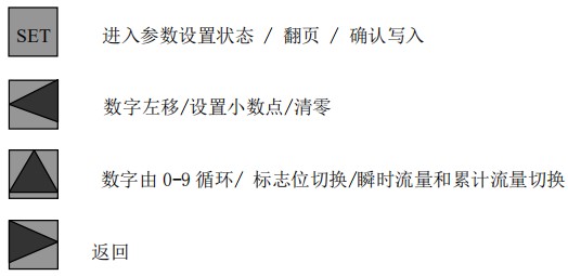 設(shè)置小數(shù)點:直接按 SET 鍵確認(rèn),進(jìn)入默認(rèn)流量參數(shù)設(shè)置菜單,顯示屏顯示 QP,按數(shù)字↑ 鍵設(shè)置標(biāo)志位。按數(shù)字← 鍵設(shè)置小數(shù)點,按→鍵可以返回菜單選擇項。