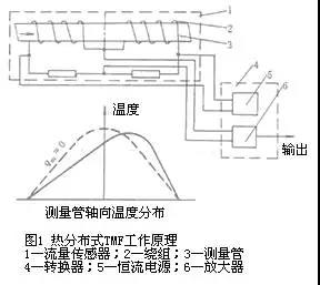 熱分布式tmf的工作原理如圖1所示,薄壁測(cè)量管3外壁繞著兩組兼作加熱器和檢測(cè)元件的繞組2,組成惠斯登電橋,由恒流電源5供給恒定熱量,通過線圈絕緣層、管壁、流體邊界層傳導(dǎo)熱量給管內(nèi)流體。邊界層內(nèi)熱的傳遞可以看作熱傳導(dǎo)方式實(shí)現(xiàn)的。在流量為零時(shí),測(cè)量管上的溫度分布如圖下部虛線所示,相對(duì)于測(cè)量管中心的上下游是對(duì)稱的,由線圈和電阻組成的電橋處于平衡狀態(tài);當(dāng)流體流動(dòng)時(shí),流體將上游的部分熱量帶給下游,導(dǎo)致溫度分布變化如實(shí)線所示,由電橋測(cè)出兩組線圈電阻值的變化,求得兩組線圈平均溫度差δt。便可按下式導(dǎo)出質(zhì)量流量qm,即