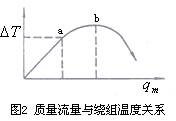 在總的熱傳導(dǎo)系數(shù)a中,因測(cè)量管壁很薄且具有相對(duì)較高熱導(dǎo)率,儀表制成后其值不變,因此a的變化可簡(jiǎn)化認(rèn)為主要是流體邊界層熱導(dǎo)率的變化。當(dāng)使用于某一特定范圍的流體時(shí),則a、cp均視為常量,則質(zhì)量流量?jī)H與繞組平均溫度差成正比,如圖2 oa 段所示。 oa段為儀表正常測(cè)量范圍,儀表出口處流體不帶走熱量,或者說帶走熱量極微;超過a點(diǎn)流量增大到有部分熱量被帶走而呈現(xiàn)非線性,流量超過b點(diǎn)則大量熱量被帶走。
