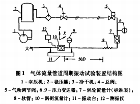 氣體流量管道周期振動試驗裝置結(jié)構(gòu)如圖1。為避免氣體壓力波動,圖中設(shè)備1先將空氣壓縮打人2中,經(jīng)3冷卻除濕后,得到的純凈氣體先后流經(jīng)4、5、7、10后,通向大氣。流量校準(zhǔn)采用渦輪標(biāo)準(zhǔn)表法,渦輪流量計內(nèi)徑50mm,流量范圍5~100m3/h,精度為1%。兩臺壓力變送器的精度均為2‰。