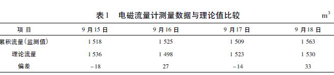 電磁流量計(jì)與V錐流量計(jì)都適用于環(huán)境較惡劣的場(chǎng)合。在測(cè)量精度上,V錐流量計(jì)要比電磁流量計(jì)高,而且安裝更靈活,對(duì)上、下游直管段的要求很短,但V錐流量計(jì)要比電磁流量計(jì)昂貴得多。電磁流量計(jì)的測(cè)量精度雖不及V錐流量計(jì),但在此應(yīng)用中完全可以滿足要求,而且運(yùn)行穩(wěn)定性和流量數(shù)據(jù)準(zhǔn)確度也很好。表1是使用電磁流量計(jì)對(duì)園區(qū)某個(gè)企業(yè)監(jiān)測(cè)點(diǎn)連續(xù)4天的累積流量監(jiān)測(cè)數(shù)據(jù)與理論流量的對(duì)比。