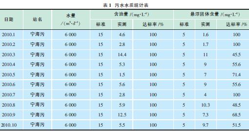 以一礦為例,2010年1~10月寧海污水站累計處理污水187萬m3,日均6200m3,1~10月份外輸污水含油累計達(dá)標(biāo)率100%,外輸懸浮物累計達(dá)標(biāo)率69.7%(見表1)。
